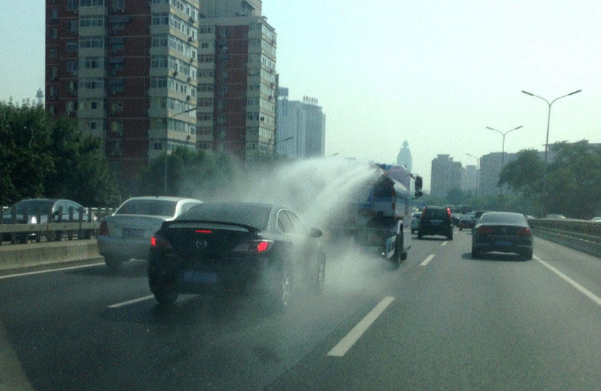 啼笑皆非!車(chē)主尾隨灑水車(chē)“蹭水洗車(chē)”