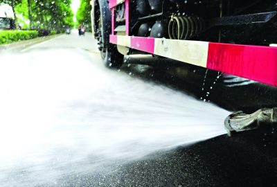 7日下午在唐家墩側(cè)路旁,江漢區(qū)城管局的灑水車正在進(jìn)行灑水測試。記者發(fā)現(xiàn)這臺灑水車與眾不同:車底部的出水口裝上了一個(gè)“鴨嘴”,噴出的水流呈扇形,且貼近地面,像一把鏟子。